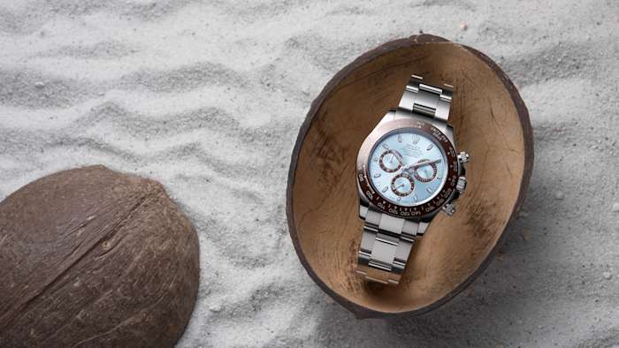The contrast between the light blue dial and the brown bezel gives this Daytona a distinct and refreshing look. It's a bold choice that stands out in the crowd, perfect for those who want to make a statement.